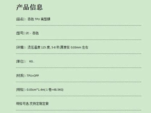 新款熱銷TPU離型膜,復(fù)合布料 免熱熔膠 免膠水 可直接復(fù)合為復(fù)合過程中省了很多環(huán)節(jié)型號(hào):ZC-杏色品名:杏色-TPU離型膜規(guī)格:0.03mm*1.4m(可定制)耐溫:125度