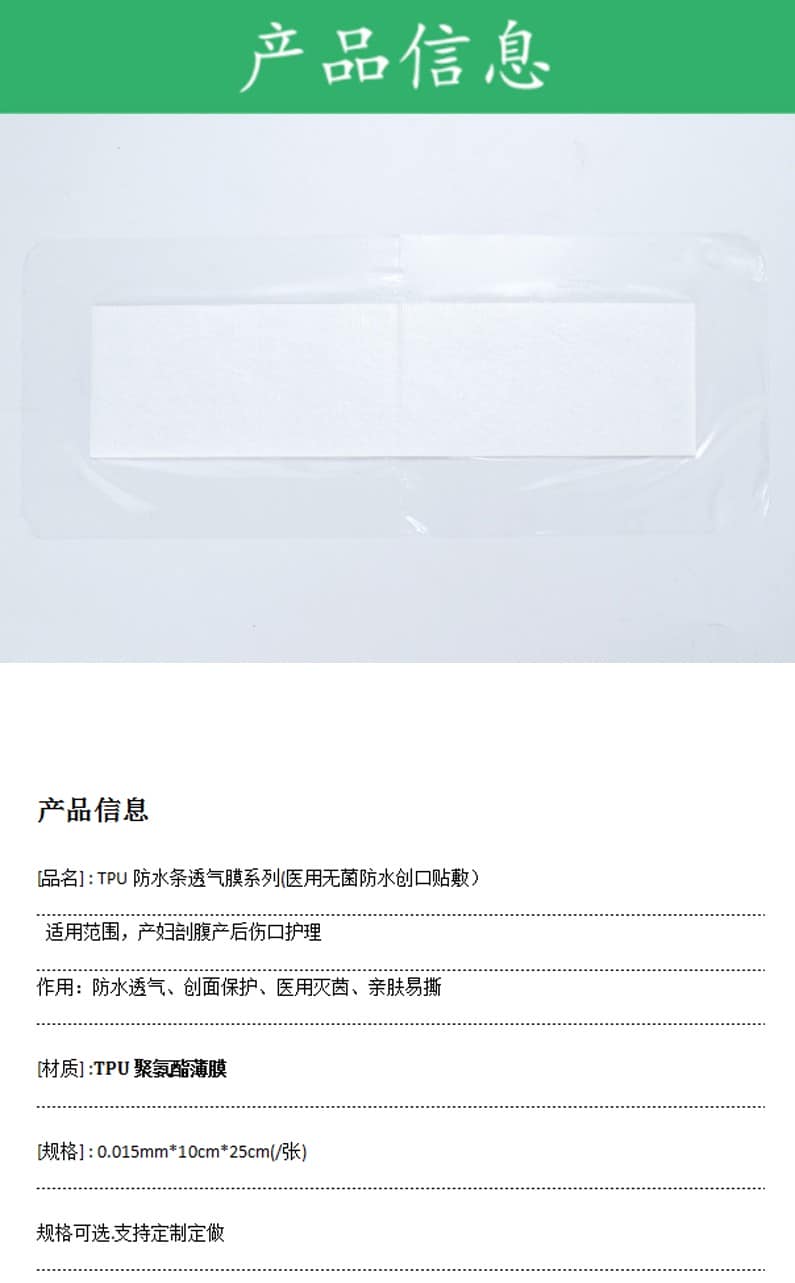 贊晨新材料,醫(yī)用防水透氣膜的作用具有防水透氣功能,在軍事、醫(yī)用、防戶外運(yùn)動(dòng)等領(lǐng)域中一直廣受關(guān)注。就如這款無菌產(chǎn)后敷貼,剖腹產(chǎn)后貼,保護(hù)剖腹產(chǎn)創(chuàng)口術(shù)后也能洗個(gè)安心...